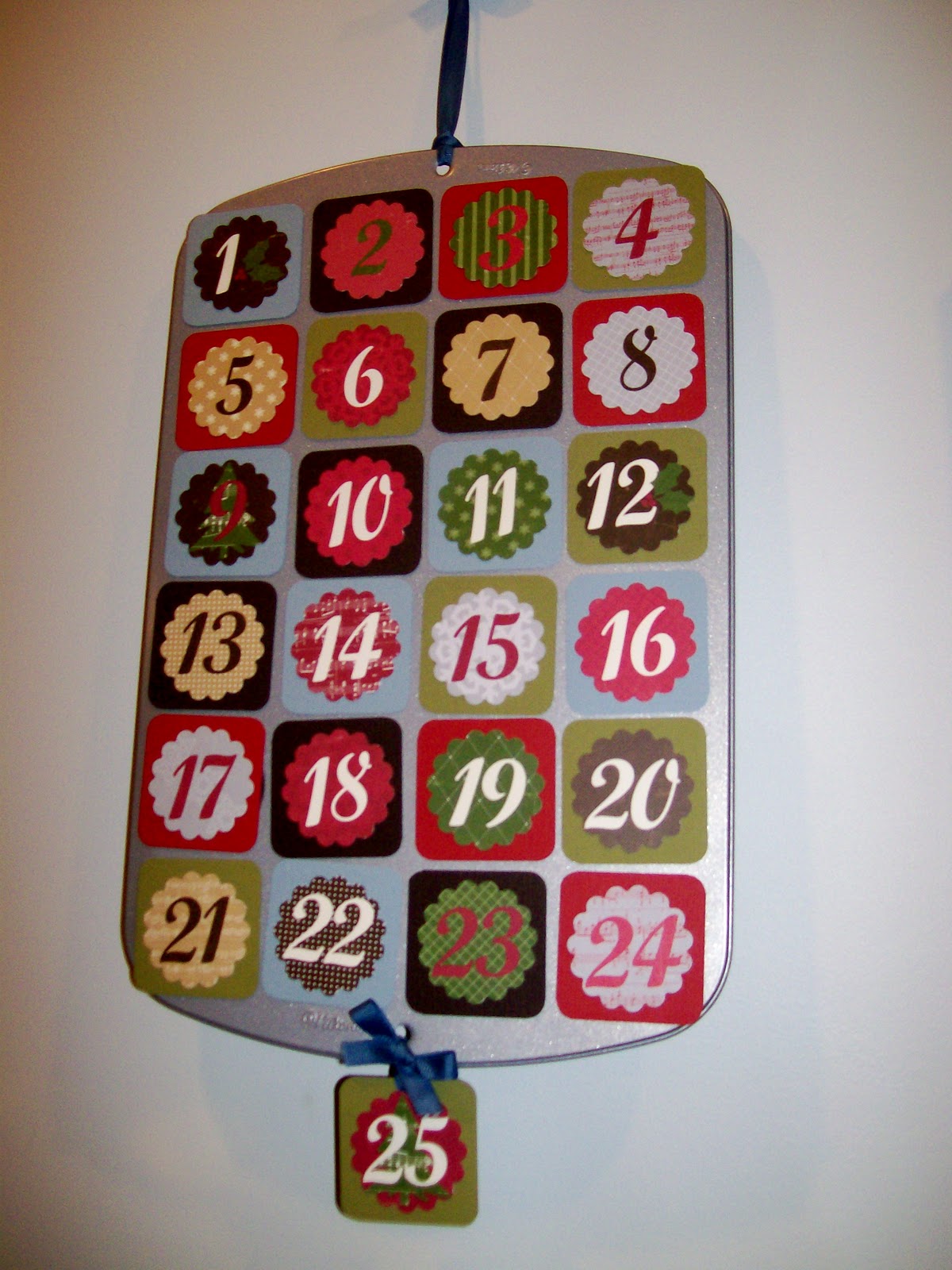 So I was inspired by this website to make an advent calendar. It was very easy to do using a mini muffin tin some card stock and a sheet of scrapbook paper that had all the numbers printed on it and a few magnets. I filled each hole with a piece of candy and a scripture verse to be read each day, telling the story of the first coming of Christ.